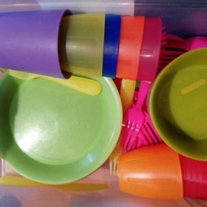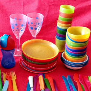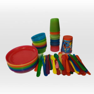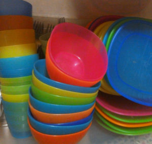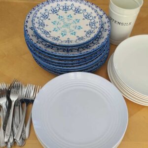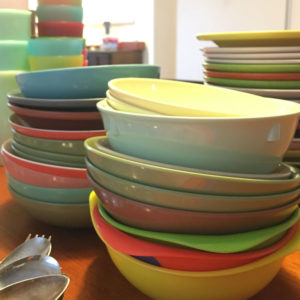 This set is outdoor-friendly, and good for both adults and kid parties. Most of the plates and bowls are melamine.