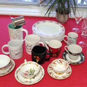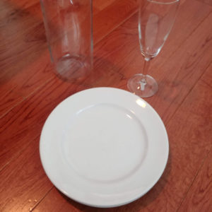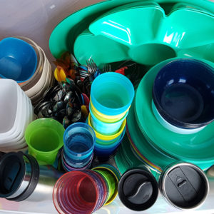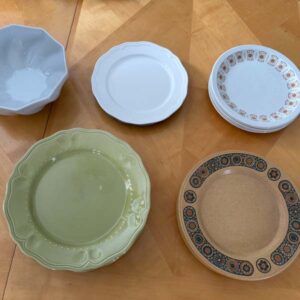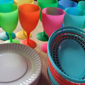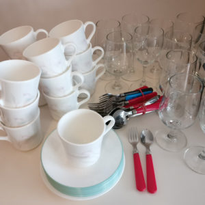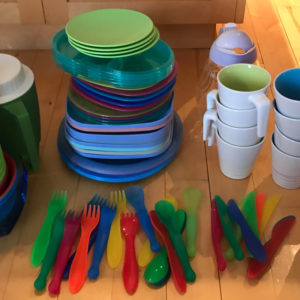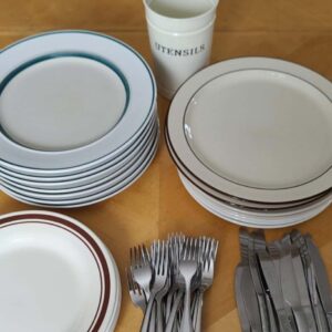 12 white plates, 11 little kids plates, 11 baskets, and 9 cups for you to borrow for your weekend party along with utensils!